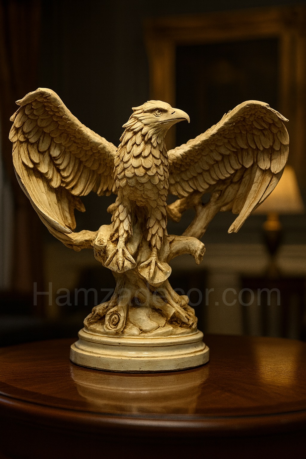 A grand and finely detailed fiber-crafted sculpture of a powerful eagle with wings fully spread, symbolizing freedom, strength, and authority. Designed in a large size, this magnificent piece makes a bold statement as a centerpiece for both home and office dΓ©cor. Its intricate feather detailing and dynamic posture capture the essence of the eagle, adding an inspiring and commanding presence to any space.