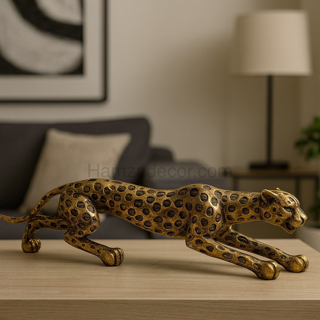 A striking fiber-crafted décor piece featuring a sleek golden cheetah in mid-stride, symbolizing speed, power, and elegance. With its detailed spotted design and dynamic posture, this sculpture makes a bold statement for both home and office table décor. Its luxurious golden finish adds a modern yet artistic touch, making it a perfect centerpiece for enhancing style and sophistication in any space.