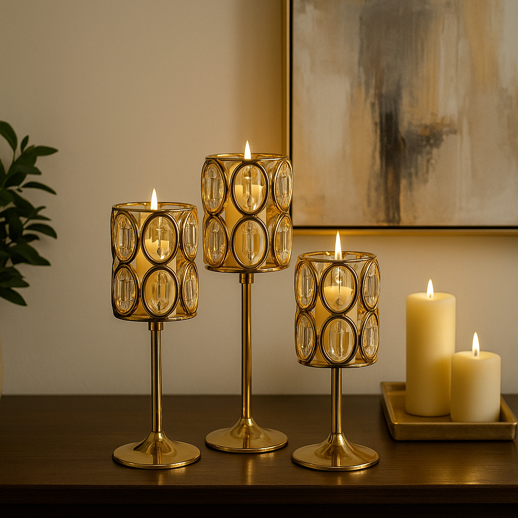 Bring timeless elegance to your décor with this 3-in-1 Crystal & Metal Candle Stand Set, featuring a golden metal frame adorned with oval-cut crystal designs. The shimmering crystals beautifully catch and reflect candlelight, creating a luxurious glow. Perfect for living rooms, dining tables, weddings, parties, and office décor, this premium candle holder set is a statement piece that adds sophistication and charm to any space