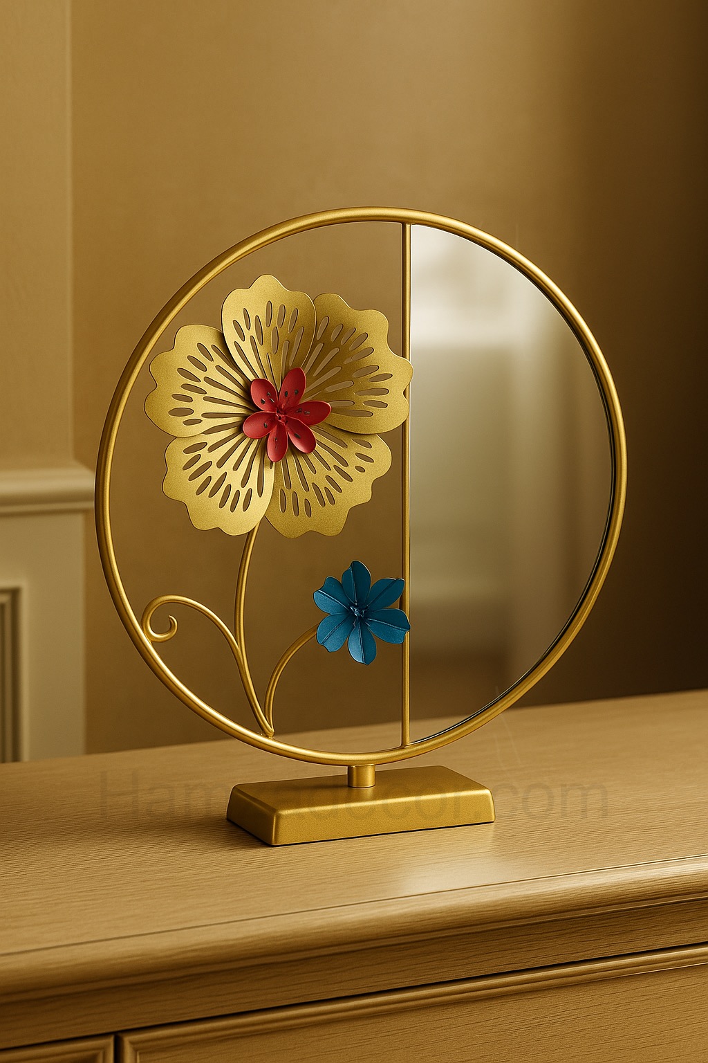 This beautifully designed metal floral table mirror adds a touch of luxury and sophistication to any modern space. Crafted with a high-quality metal frame and metal base, this piece combines durability with elegant craftsmanship.
