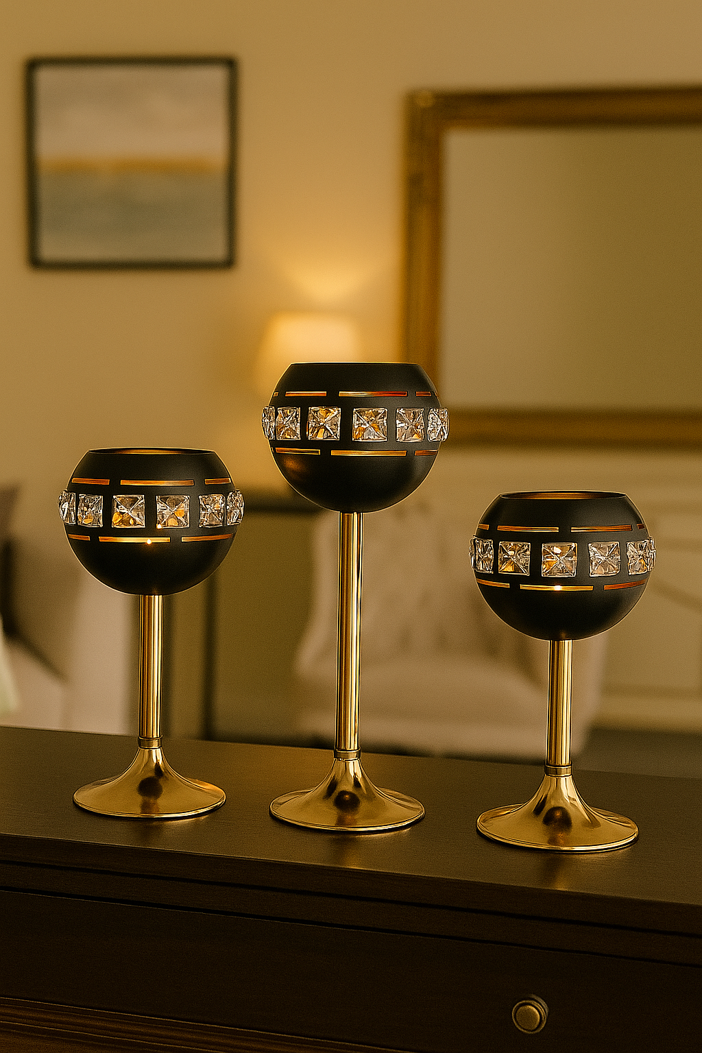 Luxury Black & Gold Crystal Candle Stand Set (3-in-1)