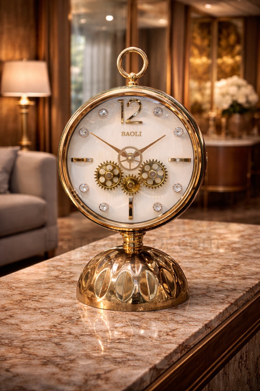 Premium imported metal table clock with a luxury golden finish, crystal detailing, working gear movement, and mirror back design. Perfect for consoles, side tables, offices, reception areas, and elegant home décor.