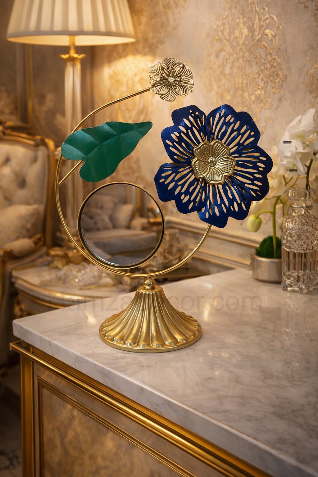 Add a touch of elegance and sophistication to your space with this beautifully crafted metal floral mirror decor. Designed with a stunning combination of metallic gold, deep blue, and rich green tones, this piece instantly elevates any corner console, side table, or shelf.