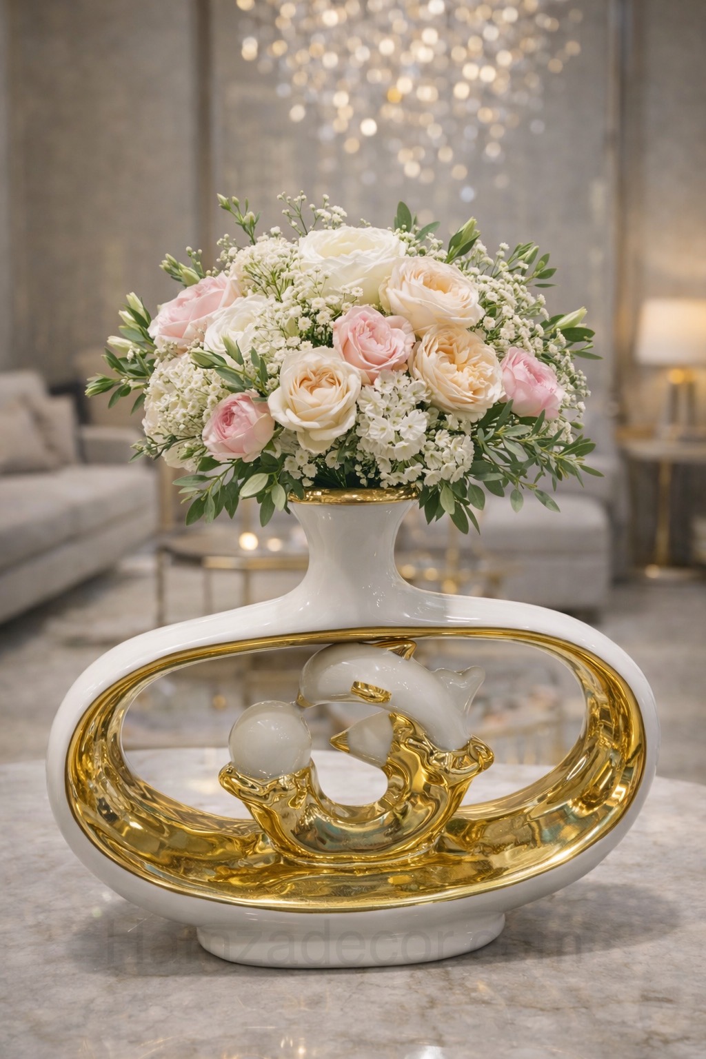 This beautifully crafted imported ceramic vase is a true statement piece for modern and luxury interiors. Designed in a unique open oval shape, it features a smooth glossy white body highlighted with rich golden accents that give it a premium and elegant look. At the center, a graceful dolphin design adds a touch of creativity and charm, symbolizing harmony and flow, making this vase stand out from ordinary décor pieces.