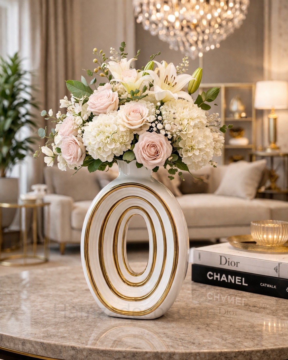 Crafted from high-quality imported ceramic, this vase offers durability with a refined luxury look. Its unique hollow-center design makes it a perfect decorative statement for coffee tables, console tables, shelves, sideboards, and luxury living spaces. Whether styled with fresh flowers, artificial arrangements, or displayed as a standalone showpiece, it enhances the beauty of any décor setting.