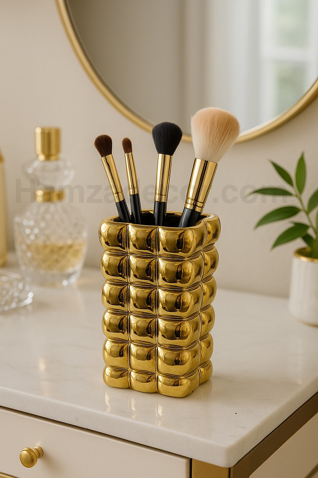 Add elegance to your vanity or workspace with this Premium Golden Brush Holder, designed with a luxurious shiny gold finish and imported quality craftsmanship. Standing 8 inches tall, this piece is perfect for organizing your makeup brushes, pens, or flowers — doubling as a stylish vase or table décor item.