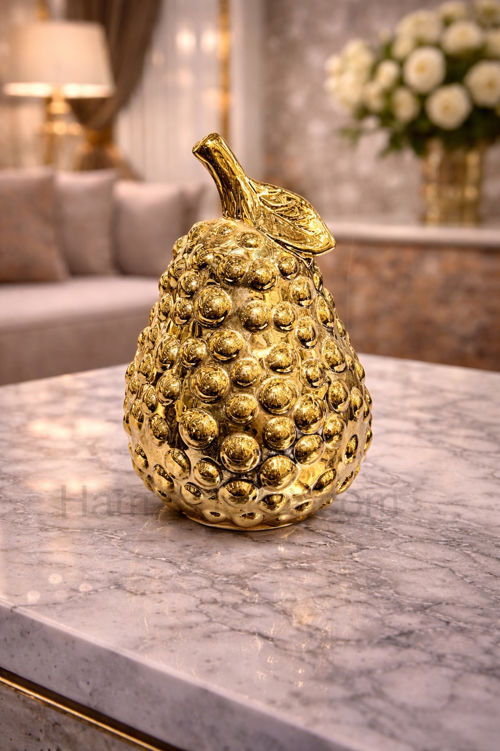 Add a touch of elegance to your space with this Golden Ceramic Pear Decor Piece, beautifully crafted from high-quality ceramic and finished with a rich, glossy gold texture. The detailed bubble-style surface and finely shaped stem give this piece a modern yet luxurious appeal.