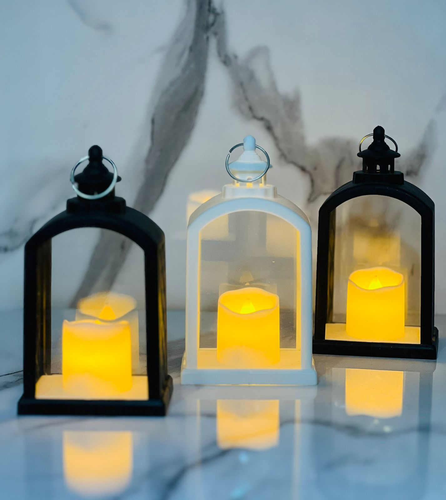 Bring warmth and elegance to your space with this Pack of 3 Decorative Lanterns, featuring front and back mirror panels that beautifully reflect the soft candlelight. Each lantern is crafted from fine imported plastic with a smooth, waterproof finish and a sturdy base color that complements any décor. Designed for both indoor and outdoor use, these lanterns include a premium LED candle powered by cell batteries — offering a safe, glowing ambiance without any mess.