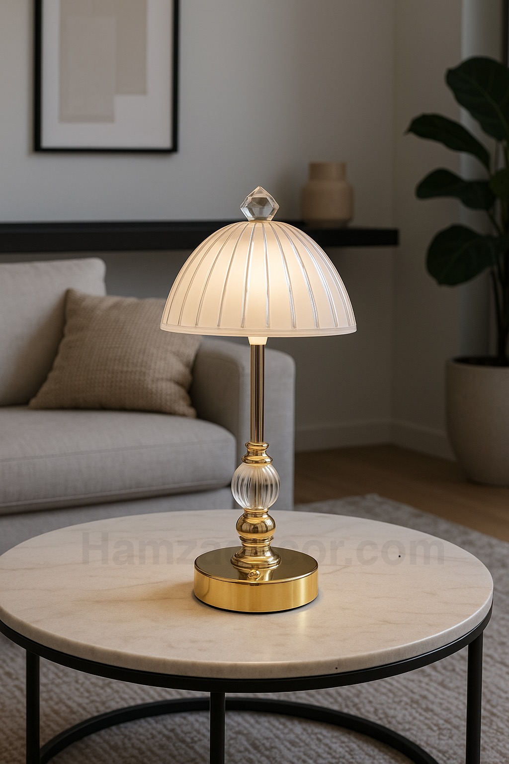 This stylish rechargeable table lamp features a premium gold finish and a beautifully crafted crystal body, making it a perfect addition to any modern living room, bedroom, or office.