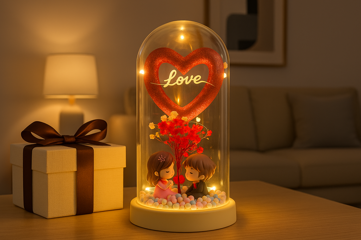 Add a touch of warmth and romance to any space with this beautifully crafted LED glass dome love showpiece. Designed with a glowing heart, delicate floral details, and an adorable couple figurine, this décor piece creates a cozy and emotional ambiance, especially when the light is turned on.
