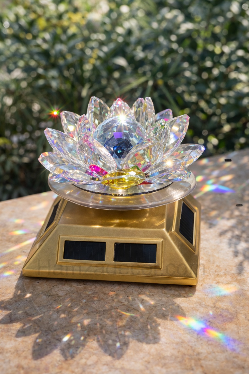 The base is equipped with built-in solar panels that absorb natural or artificial light. When placed under light, the crystal flower automatically begins to spin on its own, creating a smooth, graceful motion without the need for batteries, wires, or electricity. As it rotates, the crystal facets scatter light beautifully, producing a magical sparkle and dynamic reflections on surrounding surfaces.
