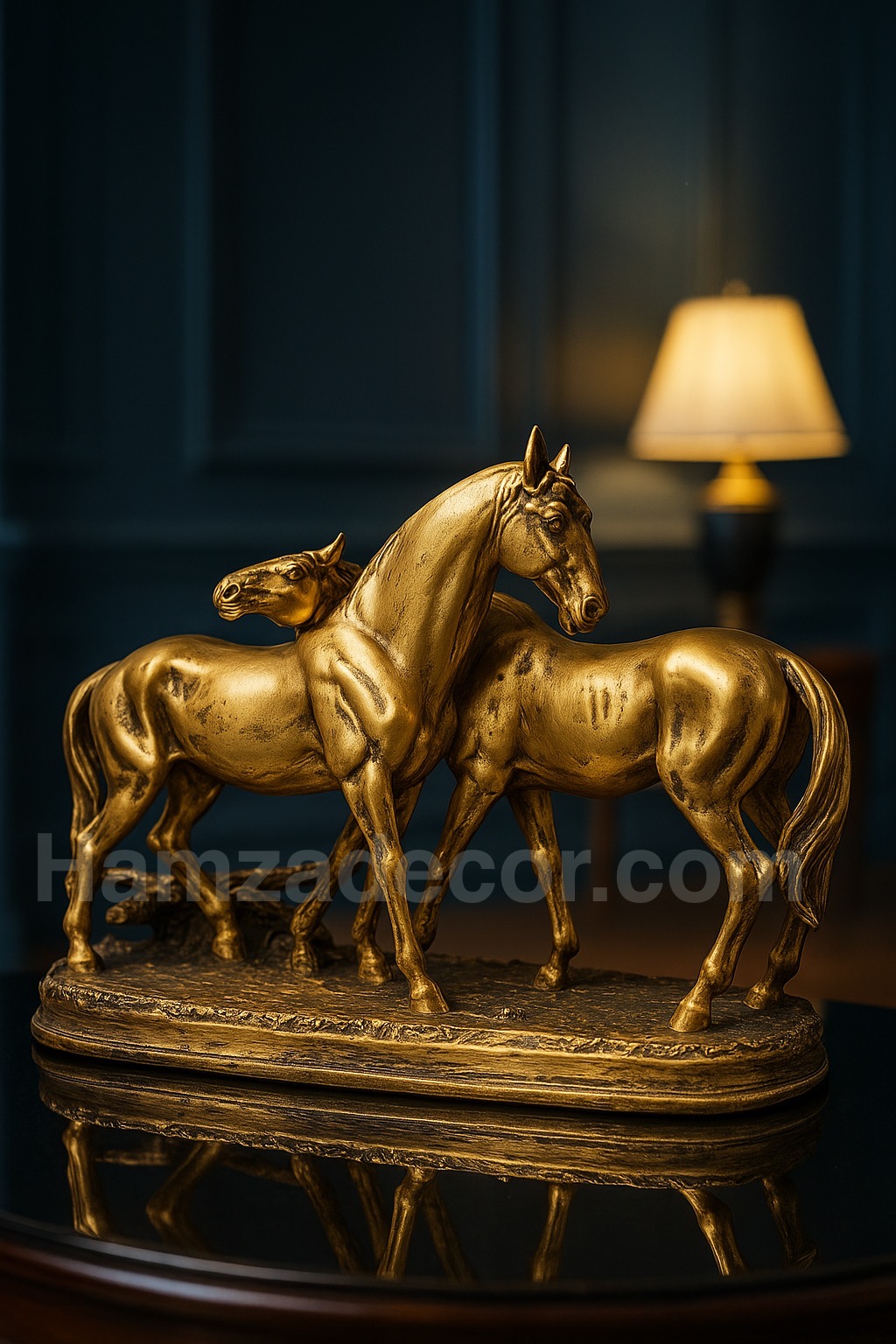 This elegant sculpture showcases a beautifully crafted pair of horses in a graceful pose, symbolizing companionship, strength, and harmony. Finished in a luxurious antique gold tone, it exudes timeless charm and sophistication. The detailed craftsmanship highlights the muscular form and natural elegance of the horses, making it a striking piece of décor. Perfect for living rooms, offices, or as a meaningful gift, this sculpture adds a regal and artistic touch to any space